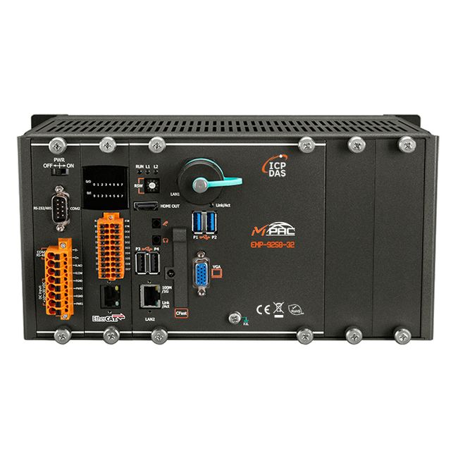 PC-совместимый промышленный контроллер SoftPLC / Intel Core i5-8365UE / 16GB DDR4 / 64GB SSD / 32GB CF / VGA / HDMI / 2xGbE LAN / 2xCOM / 4xUSB 2.0 / 8DI 19-24VDC / 8DO 24VDC / 32-оси / 10-30VDC-in / Win 10 IoT / 6 слотов расширения — ICP DAS EMP-9658-32