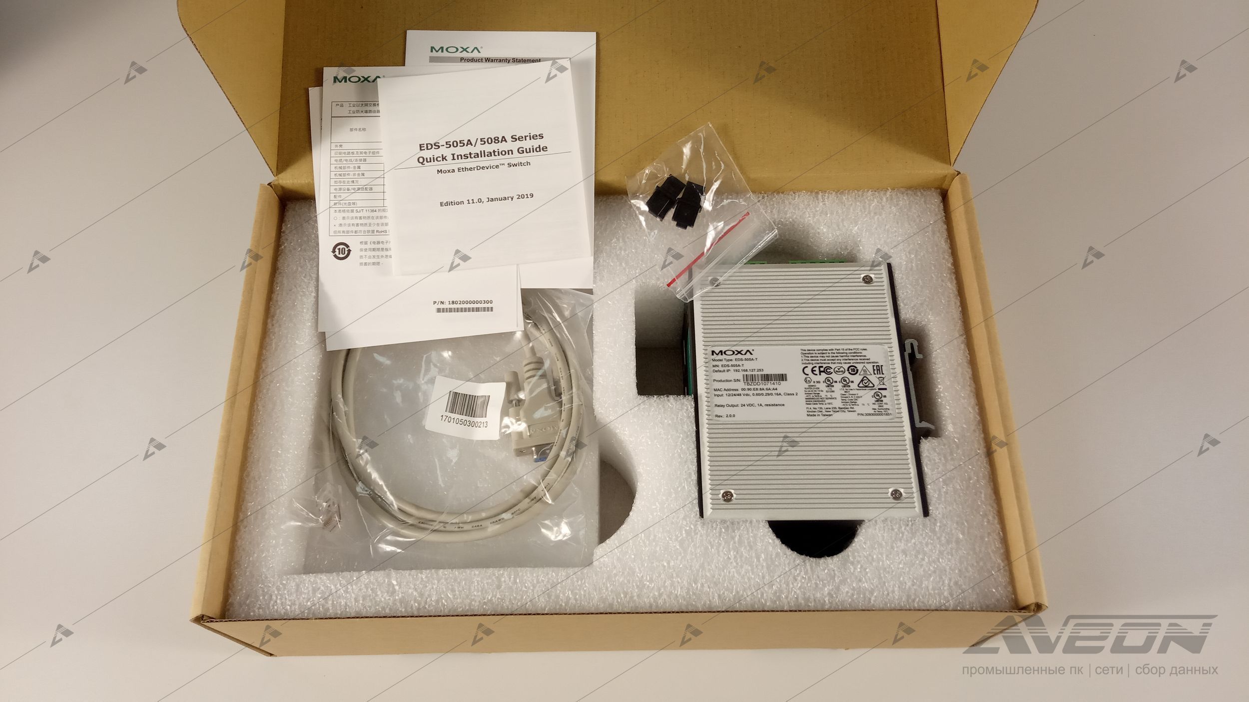 Представляем фотораспаковку — промышленный 5-портовый управляемый коммутатор 10/100 BaseT Ethernet, –40...+75°C MOXA EDS-505A-T.