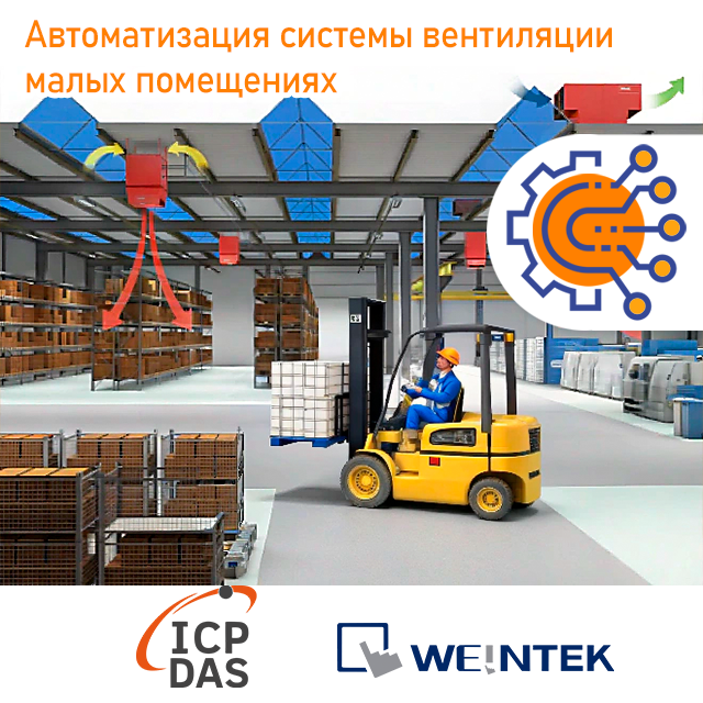 Система автоматизации вентиляции на базе оборудования ICP DAS и Weintek обеспечивает точный контроль климата, автоматическое управление вентиляторами и экономию ресурсов. Идеально подходит для небольших складских помещений.
